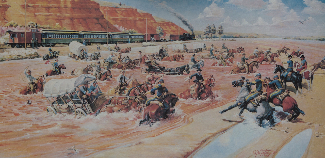 Run of 1889, crossing South Canadian River at Purcell, Oklahoma with Santa Fe Railroad in background