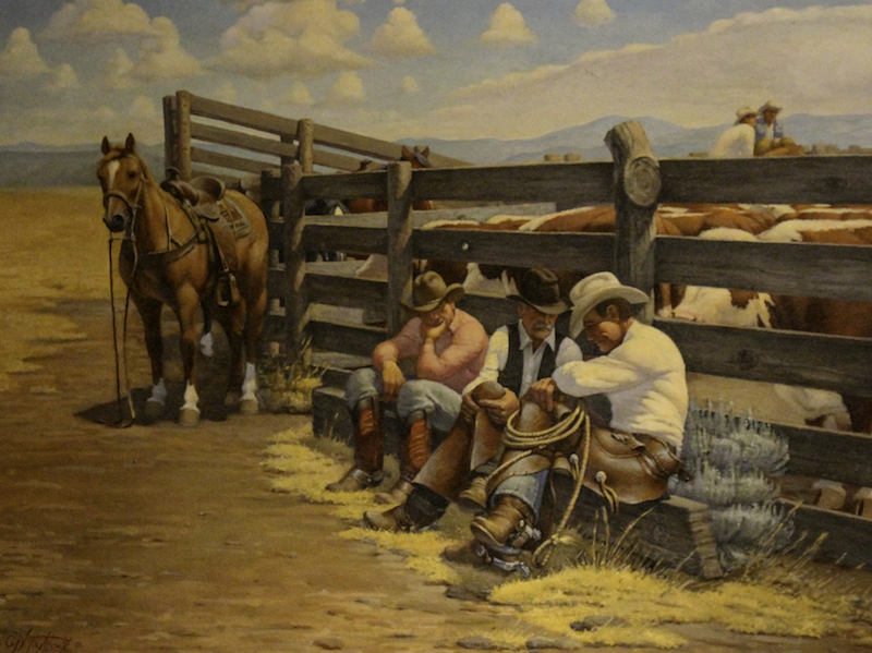 The old gentleman in the center is entertaining some of the cowhands by spinning yarns of how they did it in the old days while waiting for the trucks to arrive.