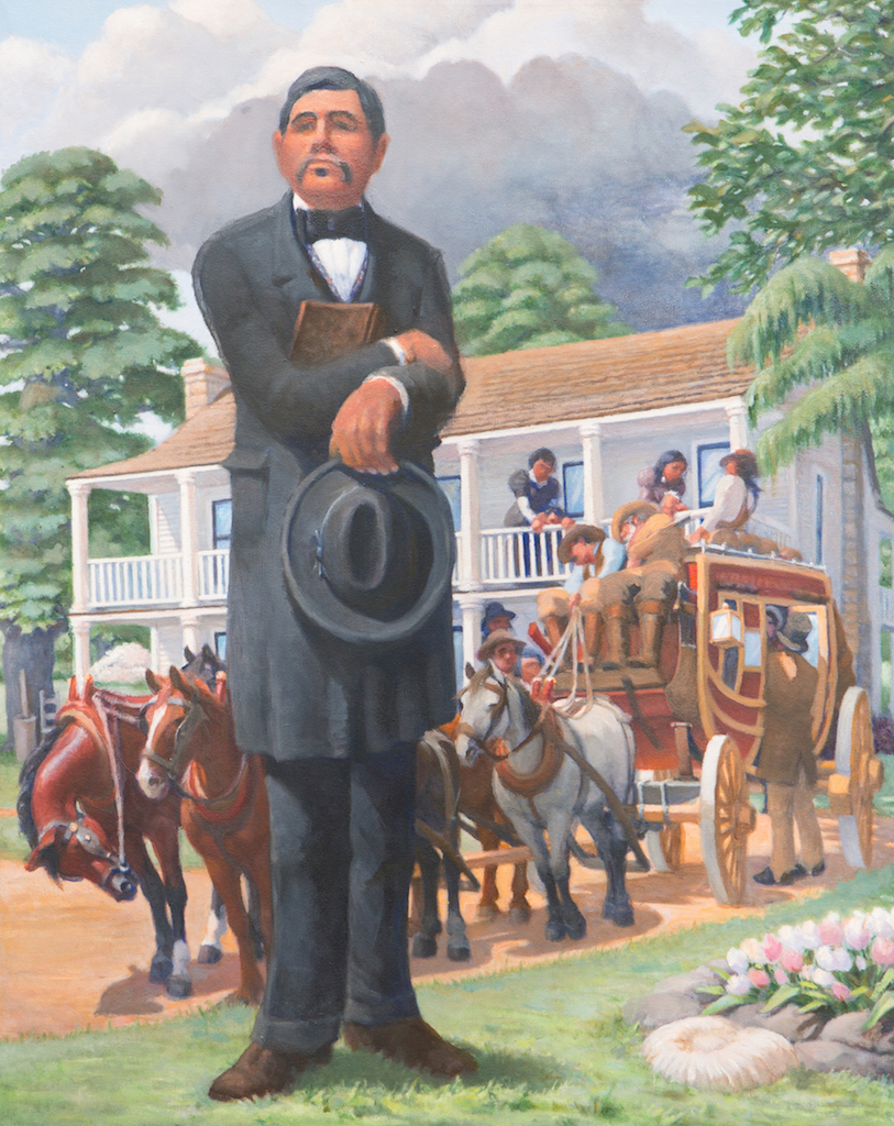Choctaw Chief Allen Wright in front of his home in Boggy Depot with the Butterfield Stage in the background. Chief Wright named Oklahoma.